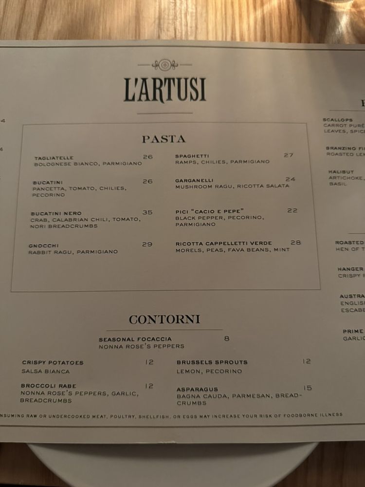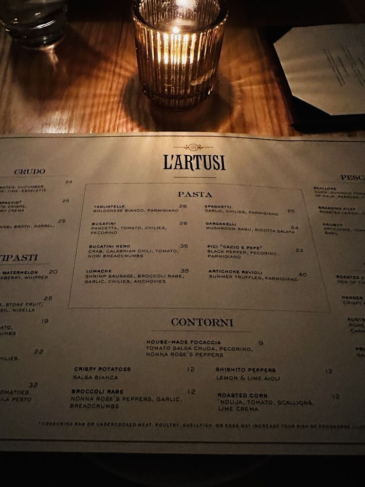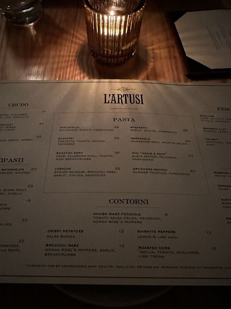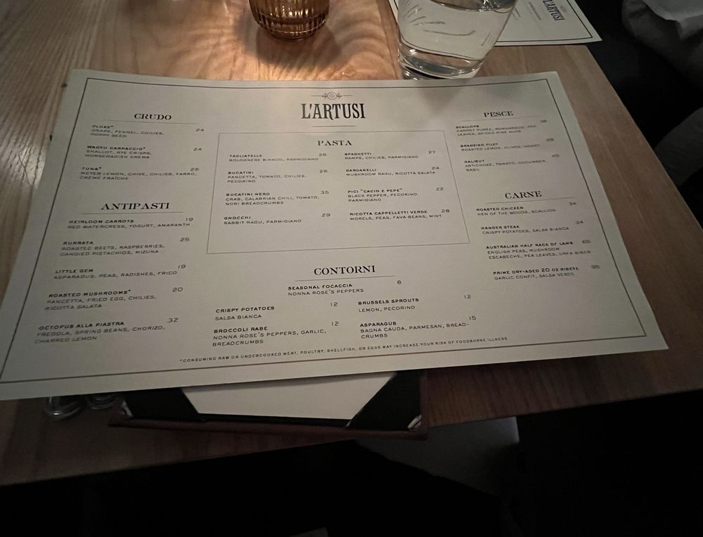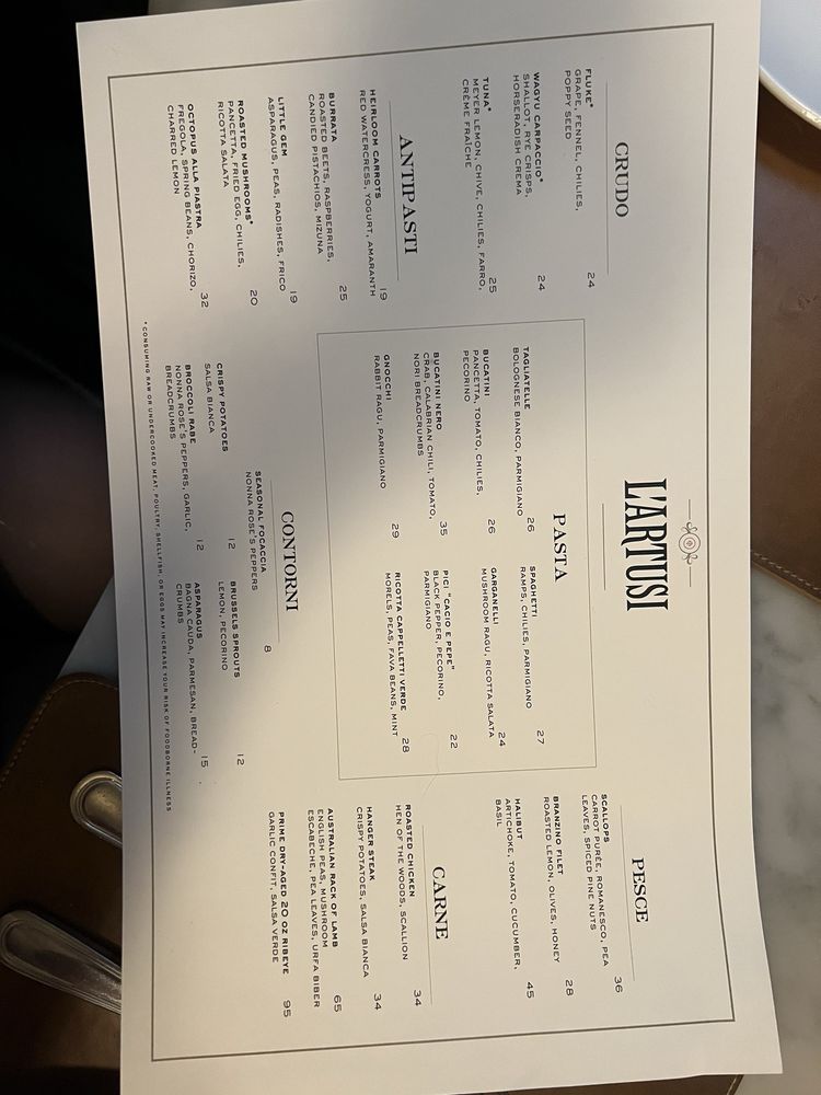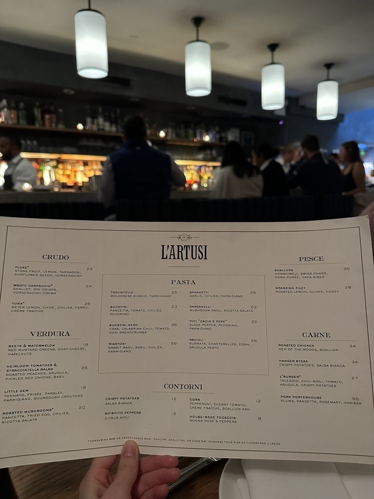 Located in New York City, L'Artusi offers a range of flavorful dishes in a trendy and vibrant setting. The menu features a variety of options, including fresh Crudo like Escolar Avocado and Beef Carpaccio, vibrant Verdura salads, and delectable Pasta dishes like Garganelli Mushroom Ragu and Tagliatelle Bolognese.